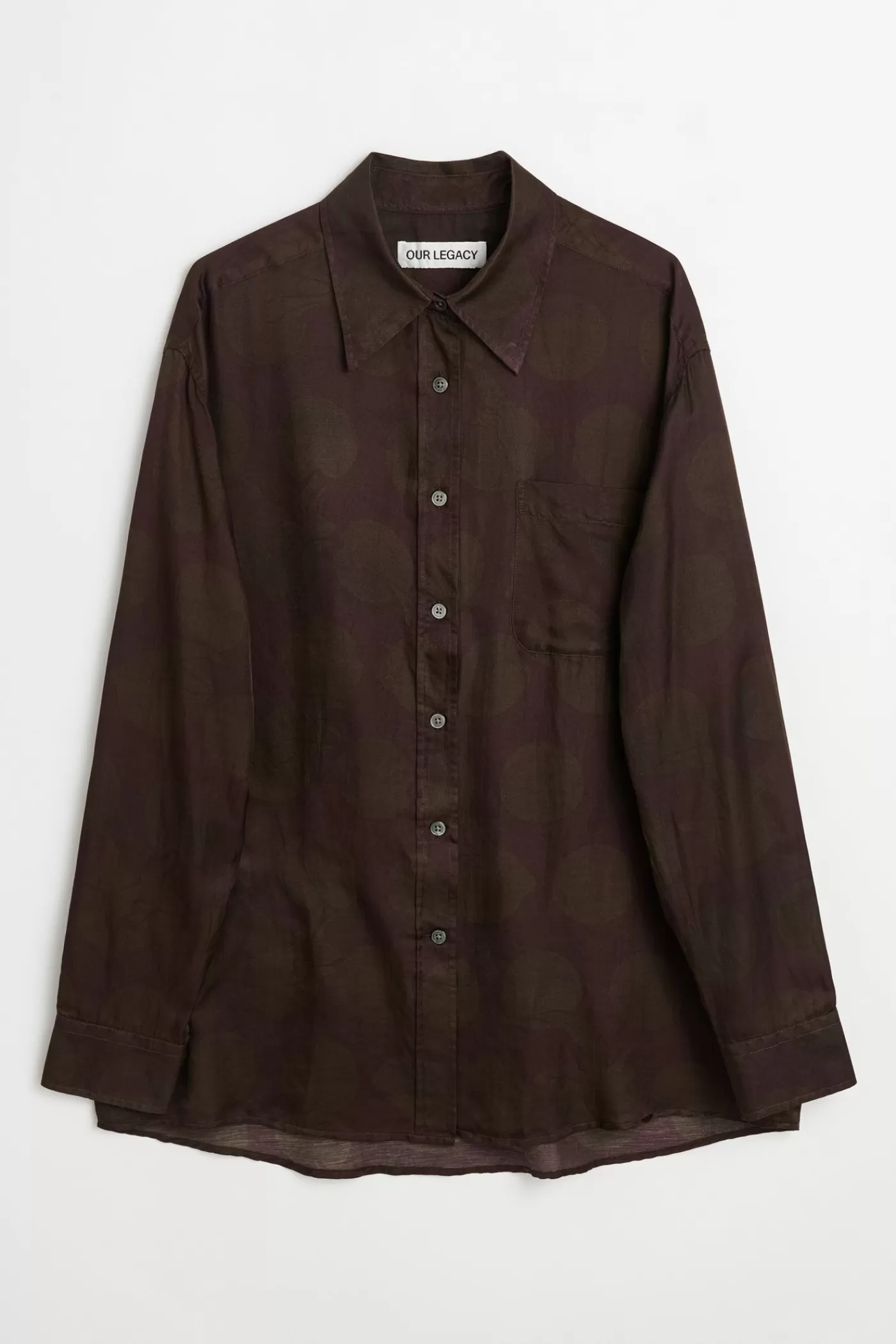 Our Favourite Shirt in It Dotted Print Cotton Silk. Produced in a Chinese cotton and silk blend fabric, with a dots print, the womens Favourite Shirt has a slightly oversized cut and features mother of pearl buttons, a single chest patch pocket, wrap side seams and mitered cuffs.