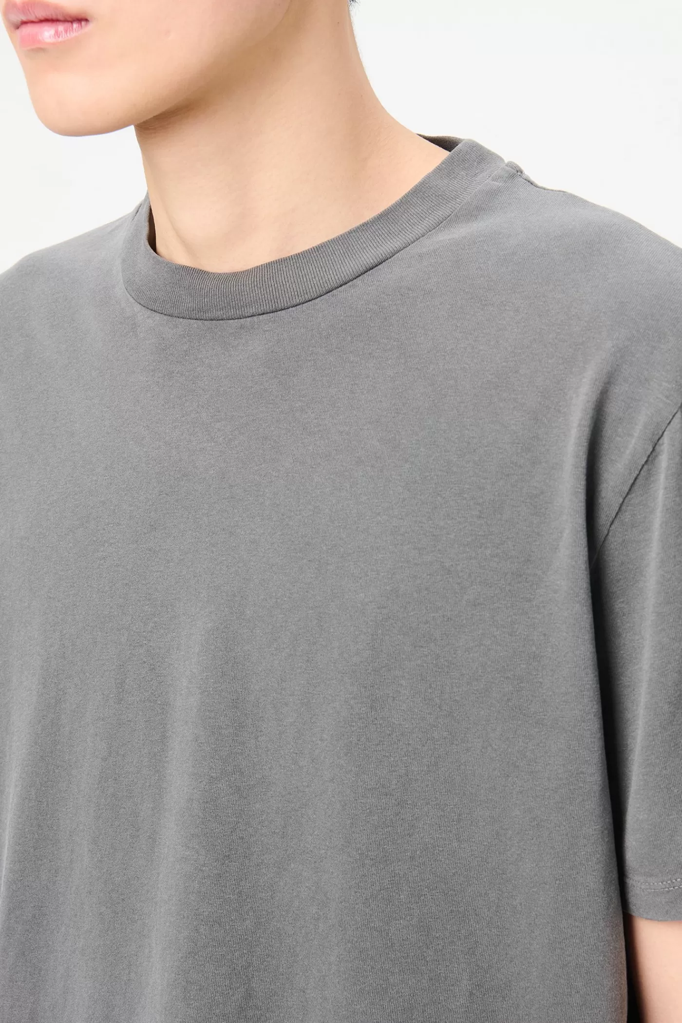 Our Box T-Shirt in Worn Black Legacy Jersey. Produced in a vintage washed Portuguese cotton jersey, the mens Box T-Shirt has a relaxed, boxy fit and features a ribbed collar and a straight hem.