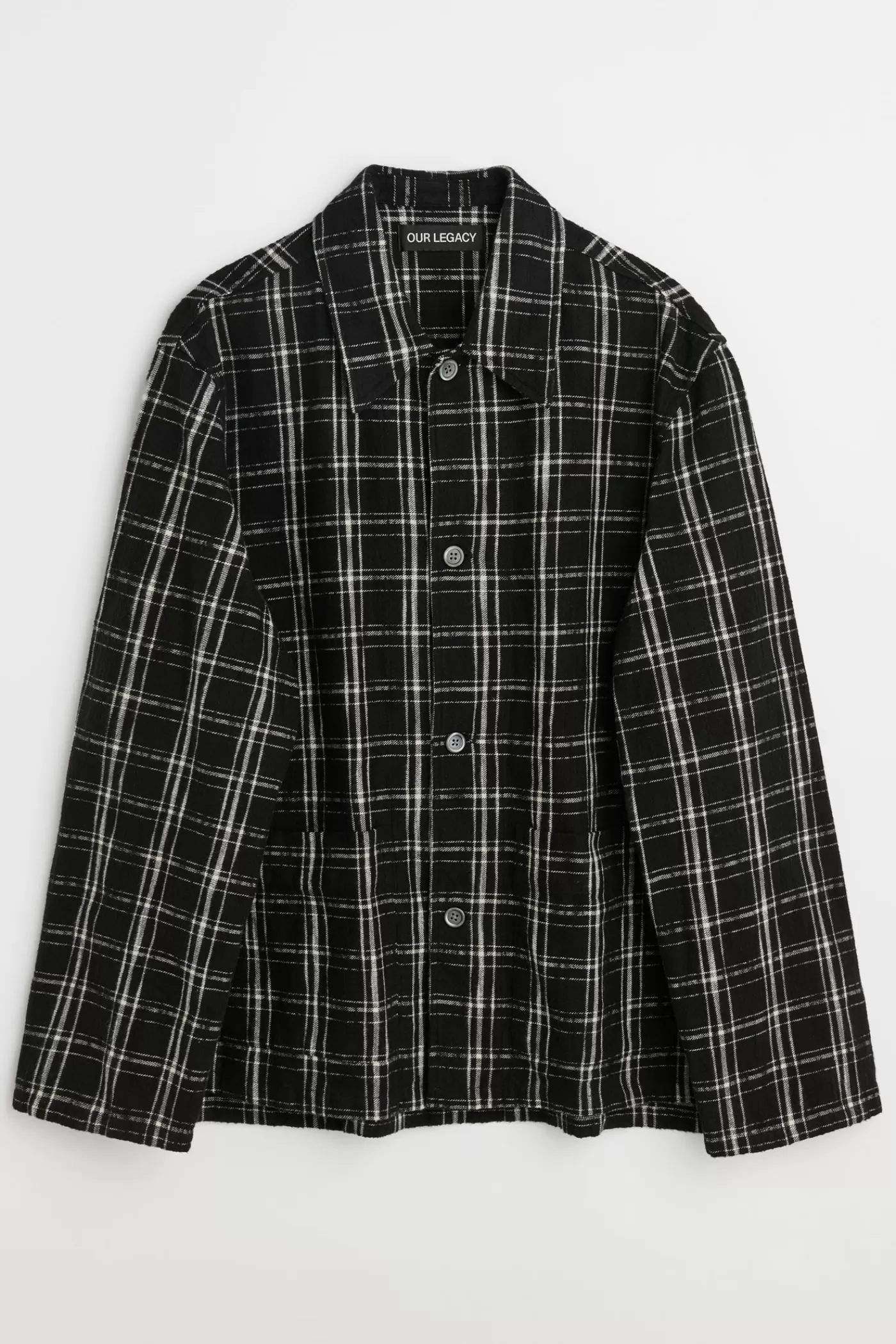 Our Haven Jacket in Black/White Helix Flannel. Produced in a Japanese checked cotton flannel, the mens Haven Jacket has a relaxed, unconstructed fit and features two front pockets, mother of pearl buttons and a spread collar.