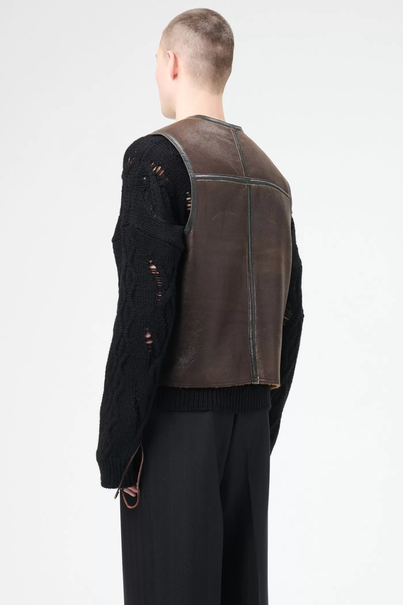 Our Reversible Shearling Vest in Rustic Grain Brown Shearling. Produced in a waxy grain Portuguese lamb shearling with a worn vintage finish, the mens Reversible Shearling Vest has a regular fit and features two leather front pockets, piped seams and a reversible zip.